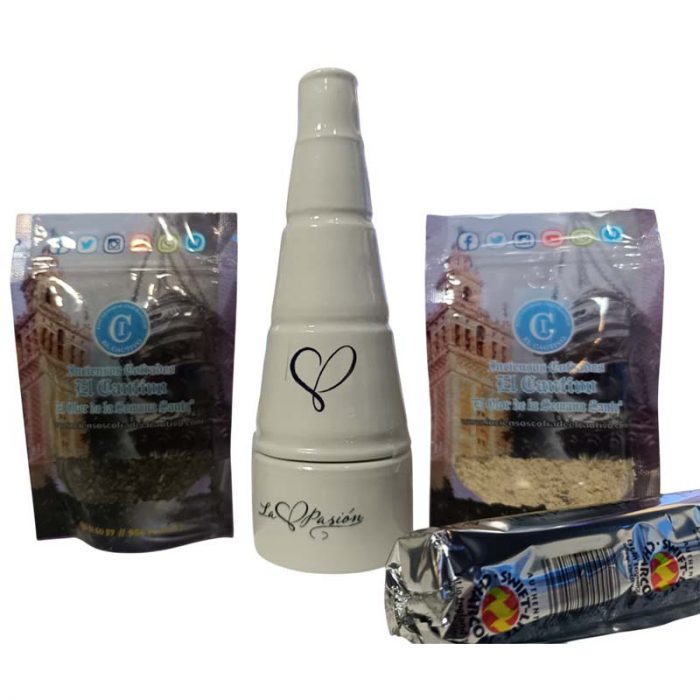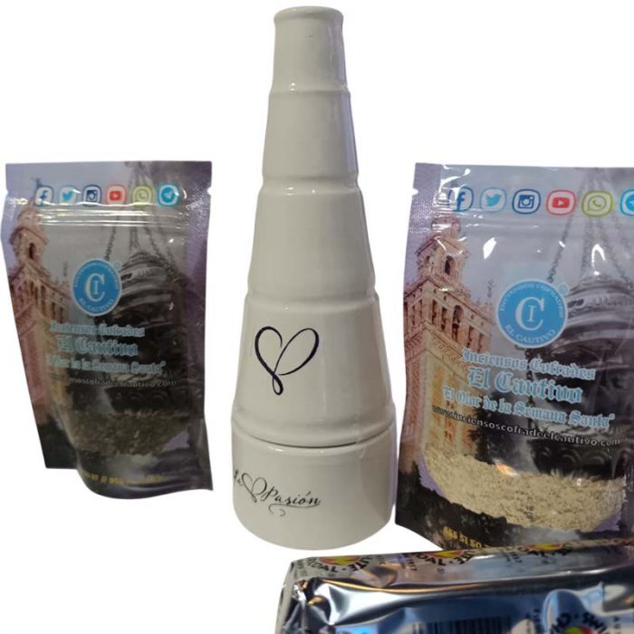 Con el inicio de esta temporada, ponemos a la venta el nuevo lote, que cada martes nuestro amigo Víctor García Rayo, regalará en el programa «La Pasión» a los invitados al mismo. Ahora tu también puedes tenerlo, hazte con él. El lote está compuesto por un elegante incensario con forma de chimenea de la Cartuja, esmaltado en blanco y con el logotipo del programa número uno dedicado a la Semana Santa, acompañan a esta bonita pieza de alfarería sevillana dos bolsas de incienso de 40 gramos, una con el incienso personalizado para el programa «La Pasión» y otro de cualquier otro tipo que usted puede elegir al hacer el pedido en el apartado «Notas del Pedido» que verá al finalizar la compra.