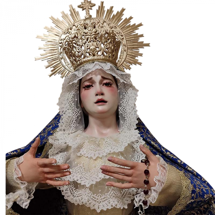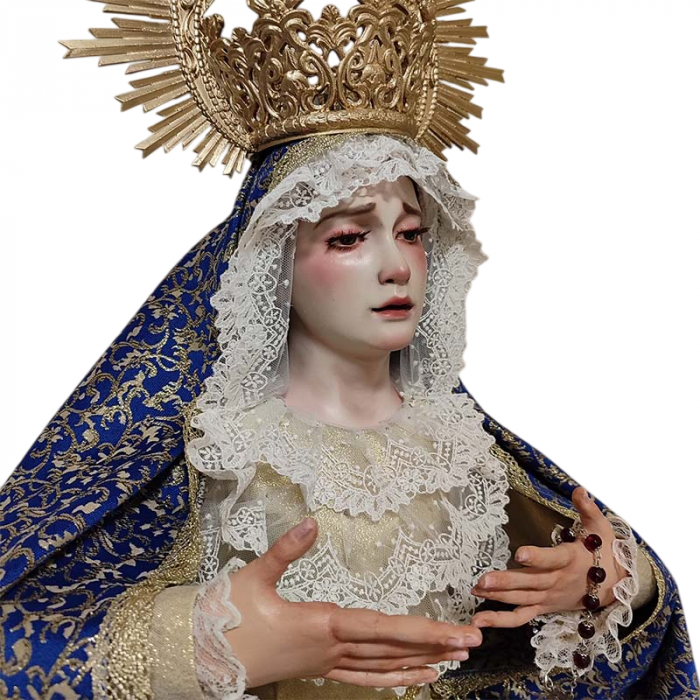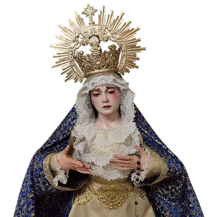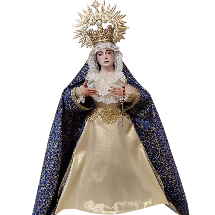 Virgen de candelero de 80 cm. exclusiva de Inciensos Cofrades El Cautivo, fabricada en pasta de madera, tiene brazos articulados y pestañas. Su precio IVA incluido es de 545,00 €. Estas imágenes se realizan por encargo y no se envían a través de agencia de transportes, para saber tiempos de entrega contacte con nosotros en el teléfono 655 51 50 37.